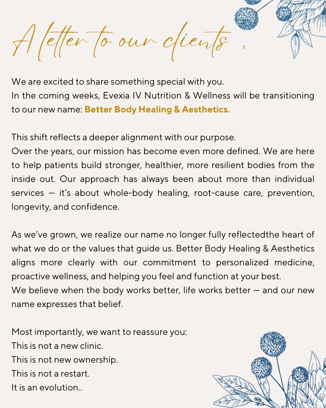 Healthcare has changed and the team at Evexia is committed to continually seeking out alternative options to healthcare. Our providers have a combined total of over 50 years in the medical field. Our goal is to help you achieve optimal wellness utilizing a preventative, holistic approach. We feel this is a better use of our skills and knowledge to help others take back their health, balance their body with IV nutrition, bioidentical hormone replacement, or a simple cosmeceutical lift in a spa like environment.